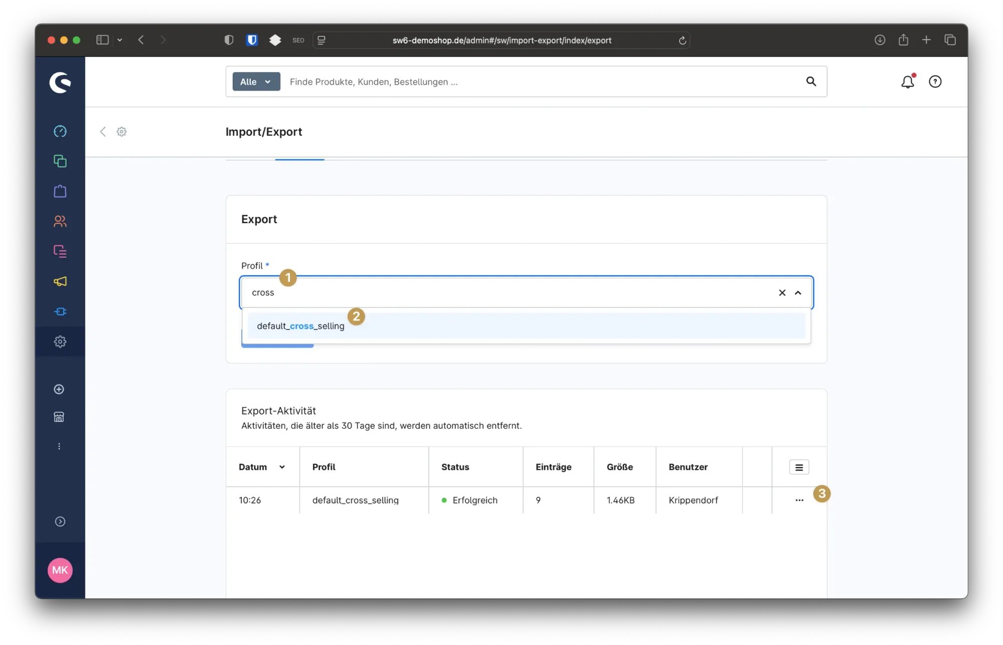 Öffne im Shopware-Adminbereich die Einstellungen und gehe in den Bereich Import/Export. Dort findest du oben ein Auswahlfeld für sogenannte Profile. Gib dort einfach den Begriff „Cross“ ein. Shopware zeigt dir dann direkt das richtige Profil für Cross-Selling-Zuweisungen an.