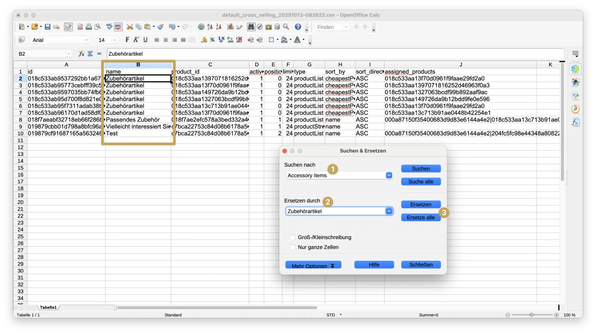 Nutze nun die Suchen-und-Ersetzen-Funktion, um alle unerwünschten Titel durch passende Begriffe zu ersetzen. Aus „Accessory Items“ wird zum Beispiel „Zubehörartikel“ oder ein anderer Begriff, der besser zu deinem Shop passt.