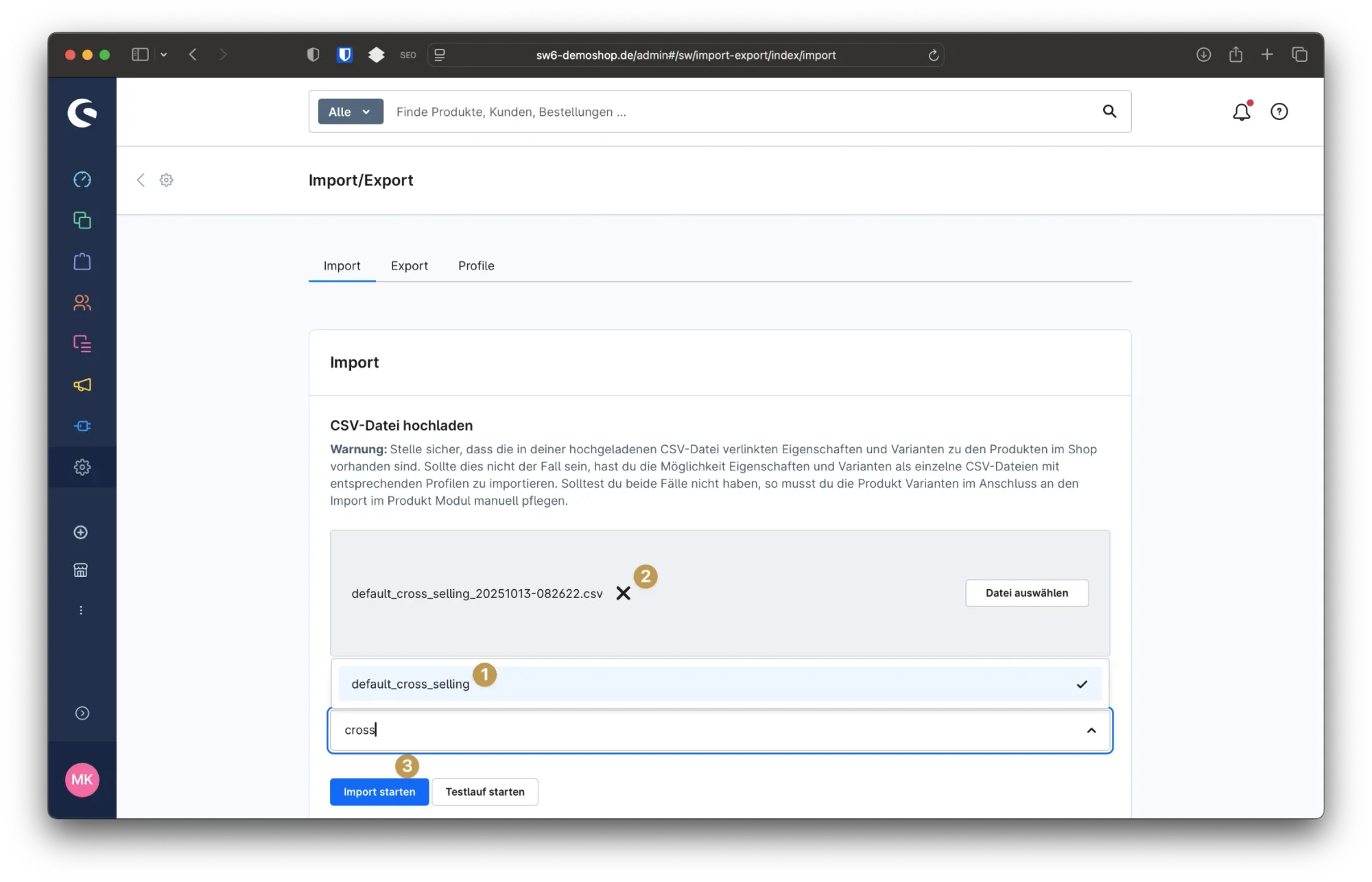 Wähle wieder das Cross-Selling-Profil aus, lade deine überarbeitete Datei hoch und starte den Import. Du kannst alternativ auch einen Testlauf durchführen, bevor du den Import abschließt.