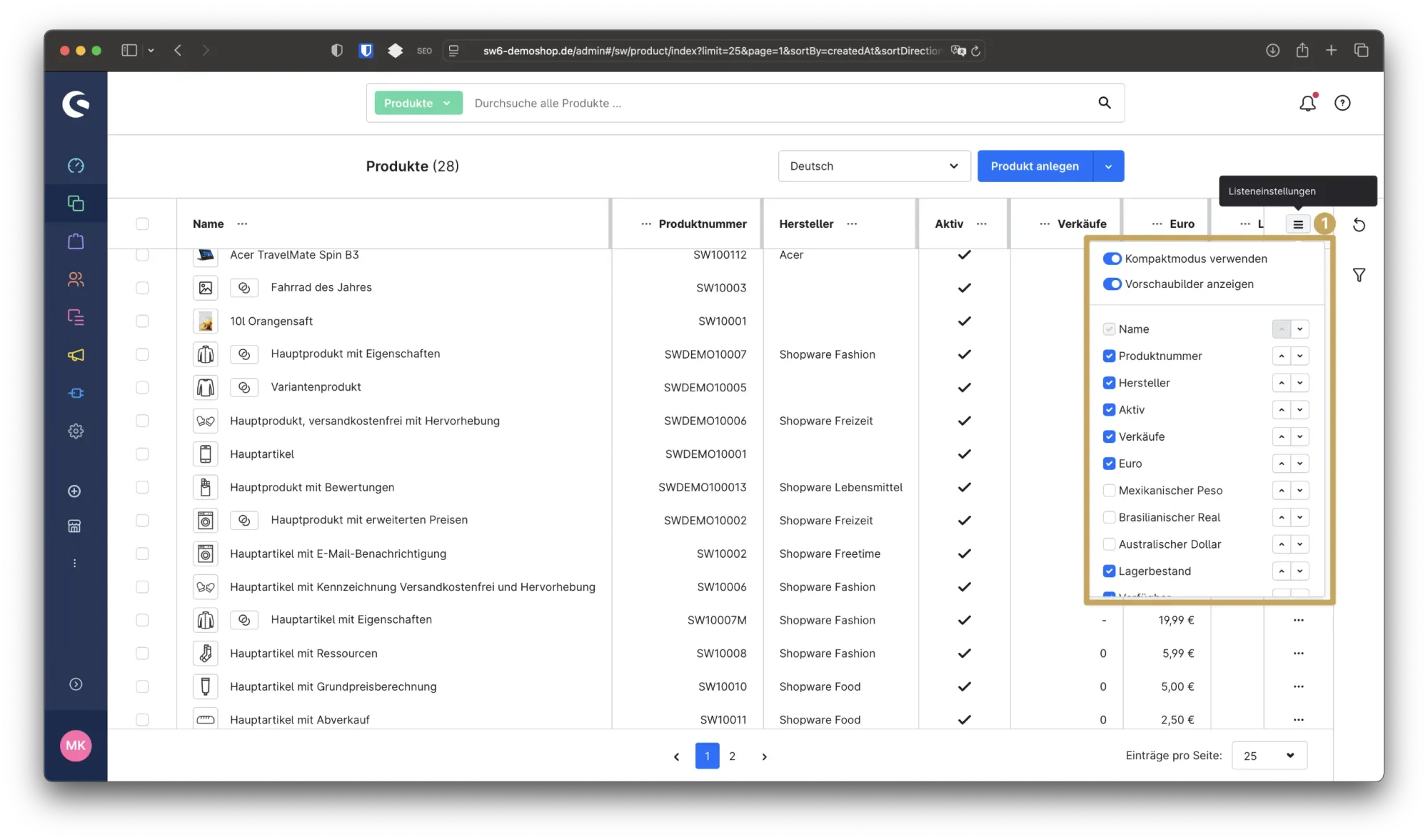 Außerdem kannst du Spalten ausblenden, die du nicht brauchst. Wenn dich zum Beispiel die Produktnummer nicht interessiert, entfernst du sie einfach aus der Ansicht. Ebenso kannst du andere Währungen anzeigen lassen, wenn du diese im Shop aktiviert hast.