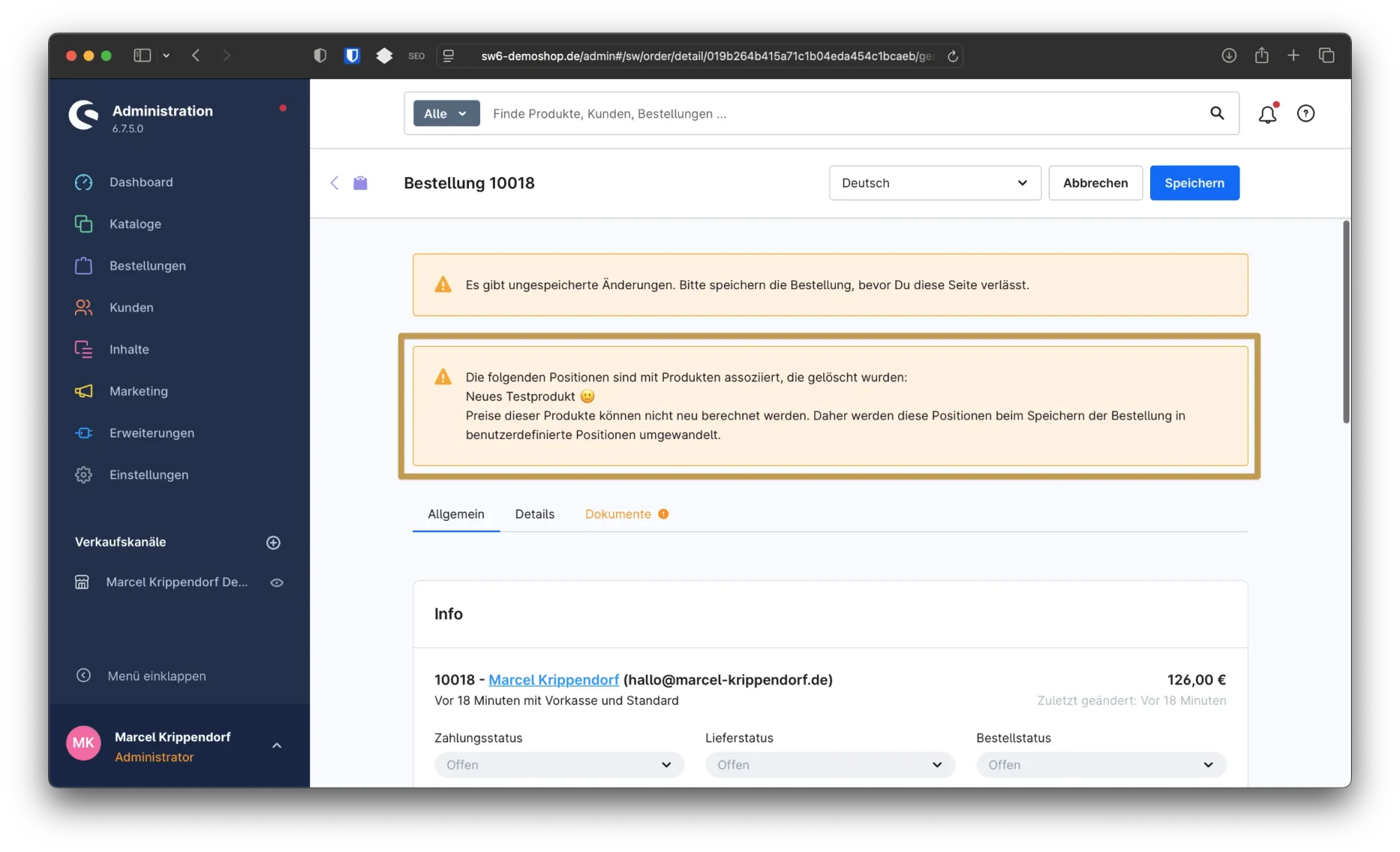 Konkret bedeutet das, dass die Preise dieser Produkte nicht mehr neu berechnet werden können. Sobald du eine solche Bestellung speicherst, wandelt Shopware die betroffenen Positionen in benutzerdefinierte Positionen um. Ab diesem Moment kennt das System den ursprünglichen Artikel technisch nicht mehr und behandelt ihn nur noch als Platzhalter ohne echte Artikelbindung.